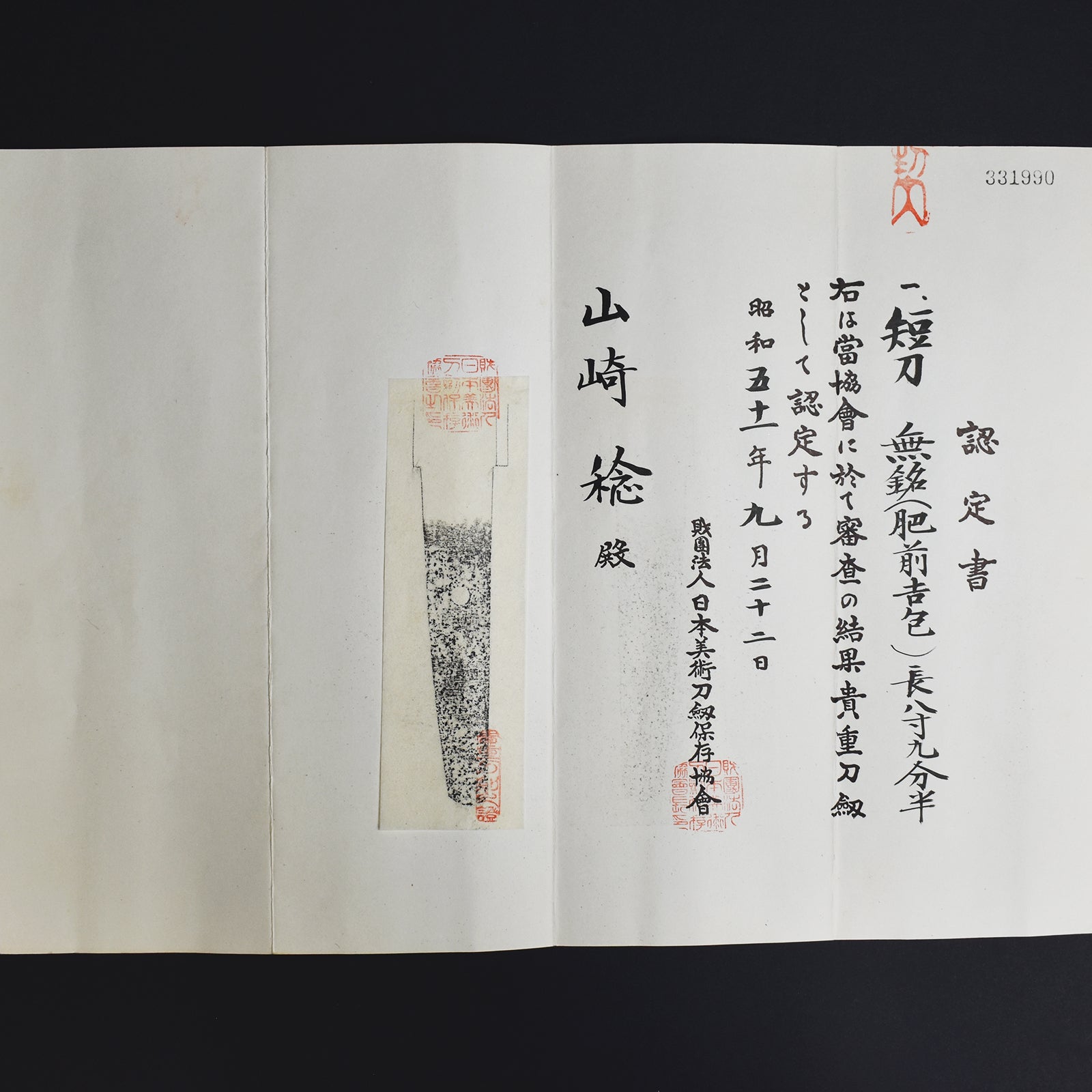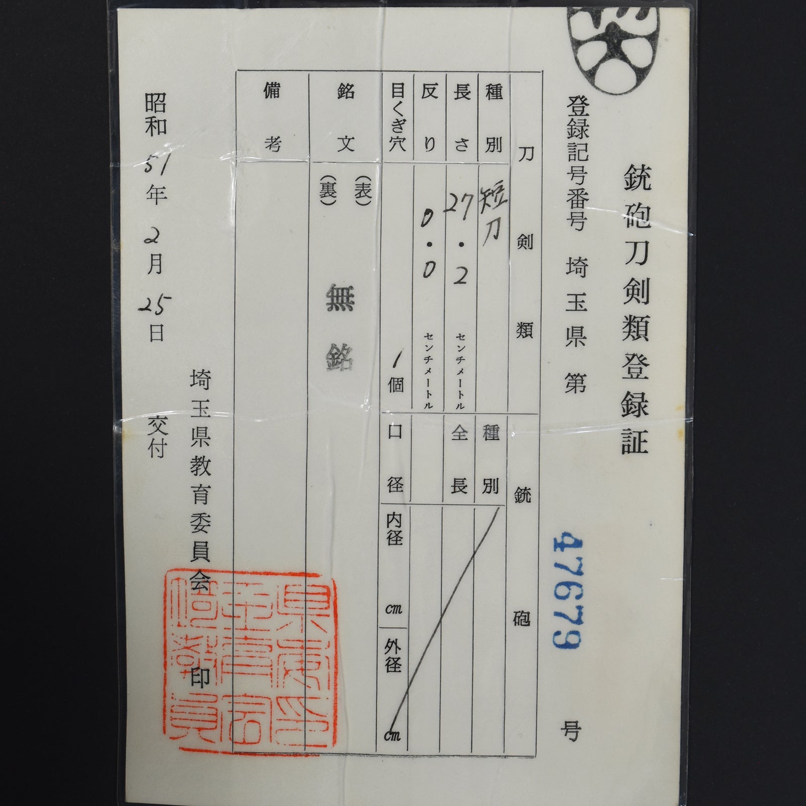 ・All our swords with hand forged blade are registered in the Agency for Cultural Affairs as artwork and The Board of Education(Cultural properties protection Committee); therefore each sword has the registration card, issued by the Board of Education.