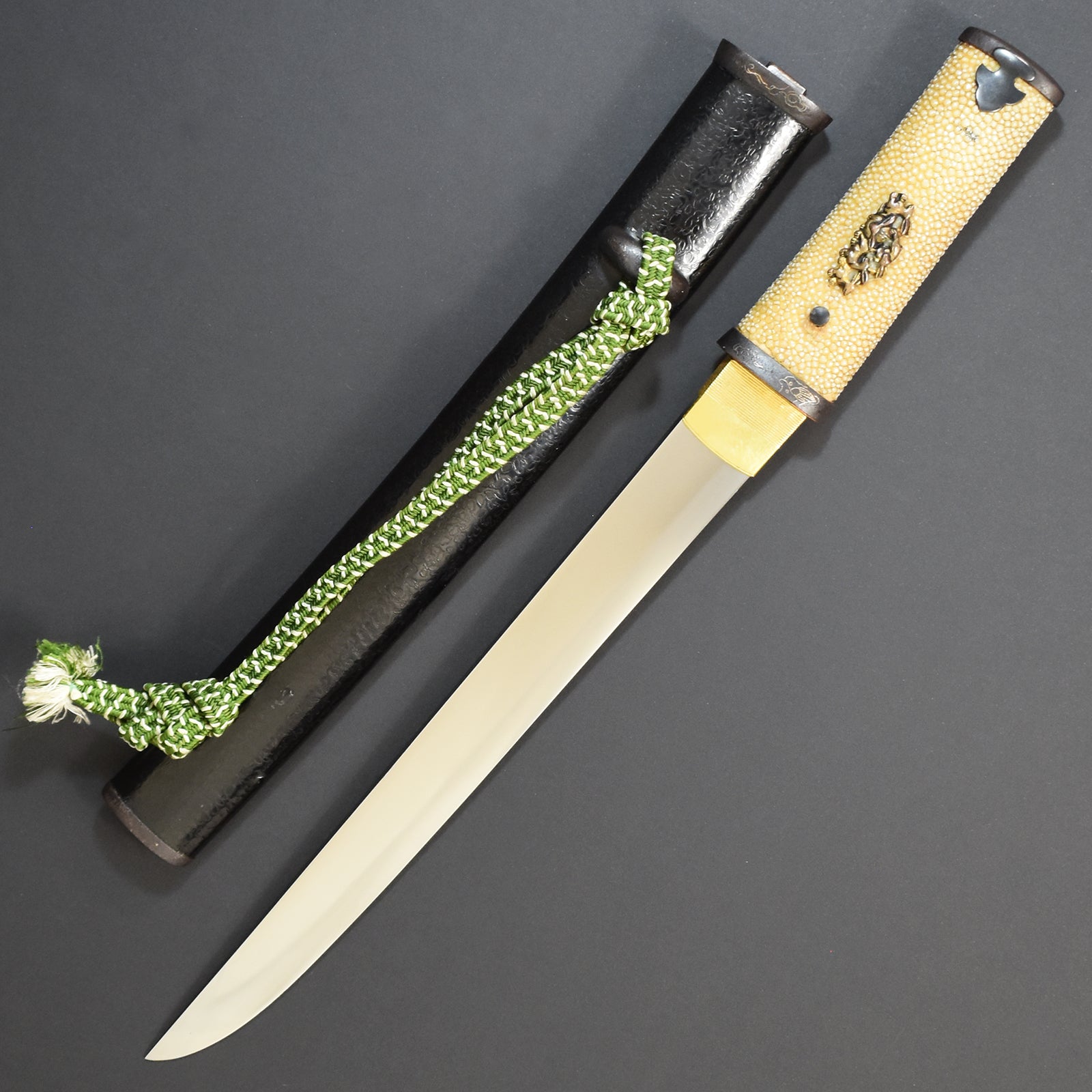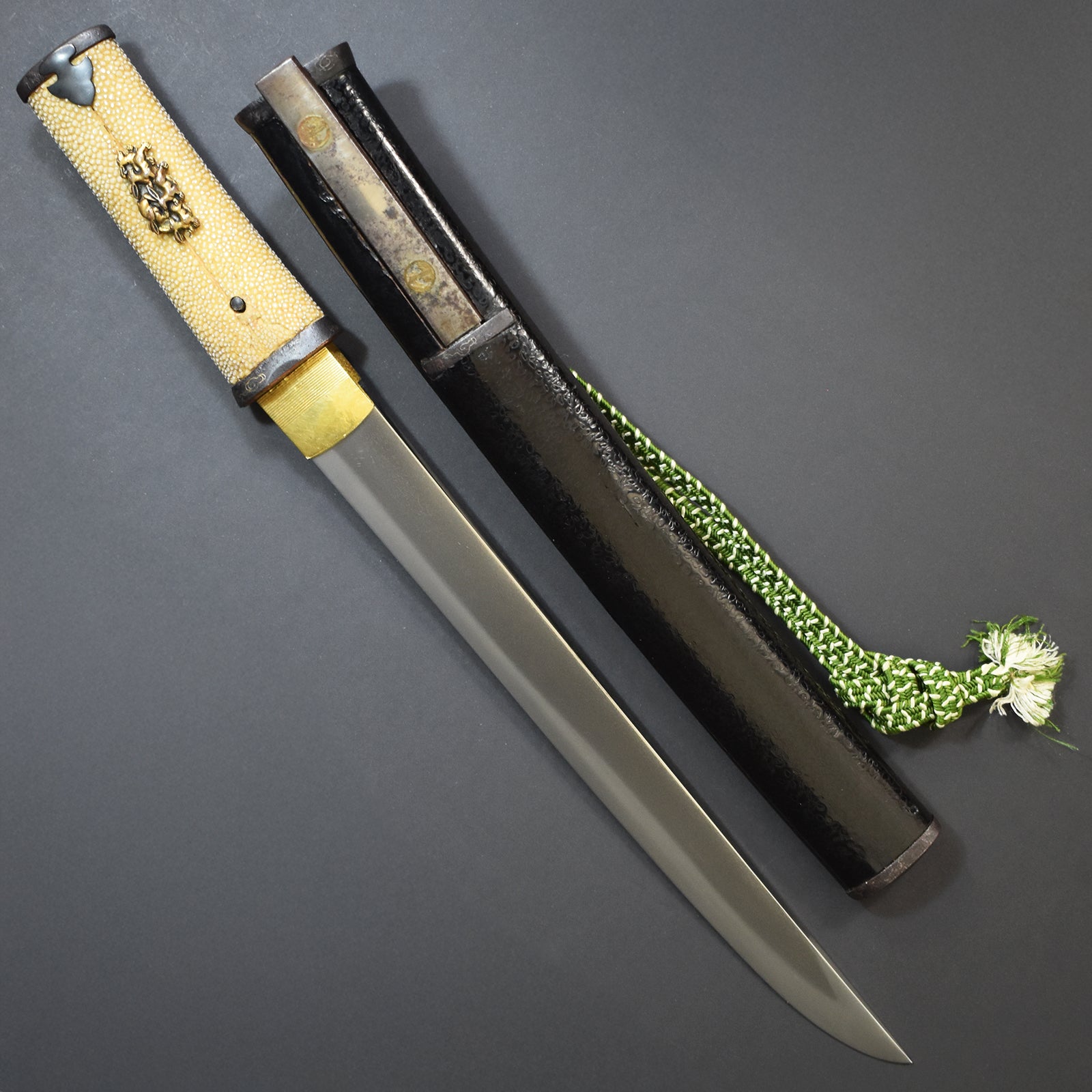 Please pay attention to amazing hamon and good hada texture on the hirazukuri blade and elaborate high grade koshirae with excellent parts.