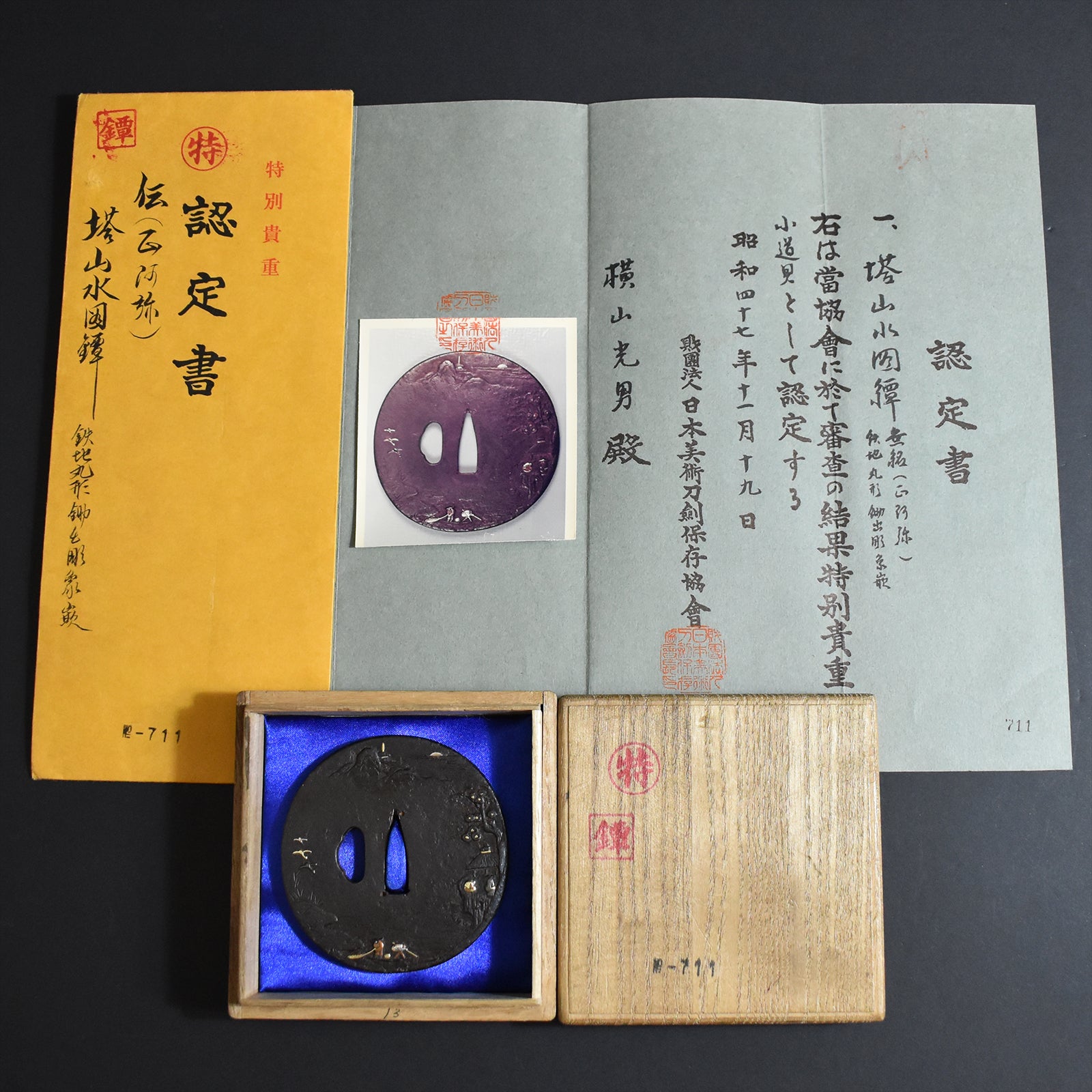 Authentic Japanese TSUBA SHOUAMI 正阿弥 塔山水図鐔w/NBTHK TOKUBETSU KICHO PAPER ANTIQUE
