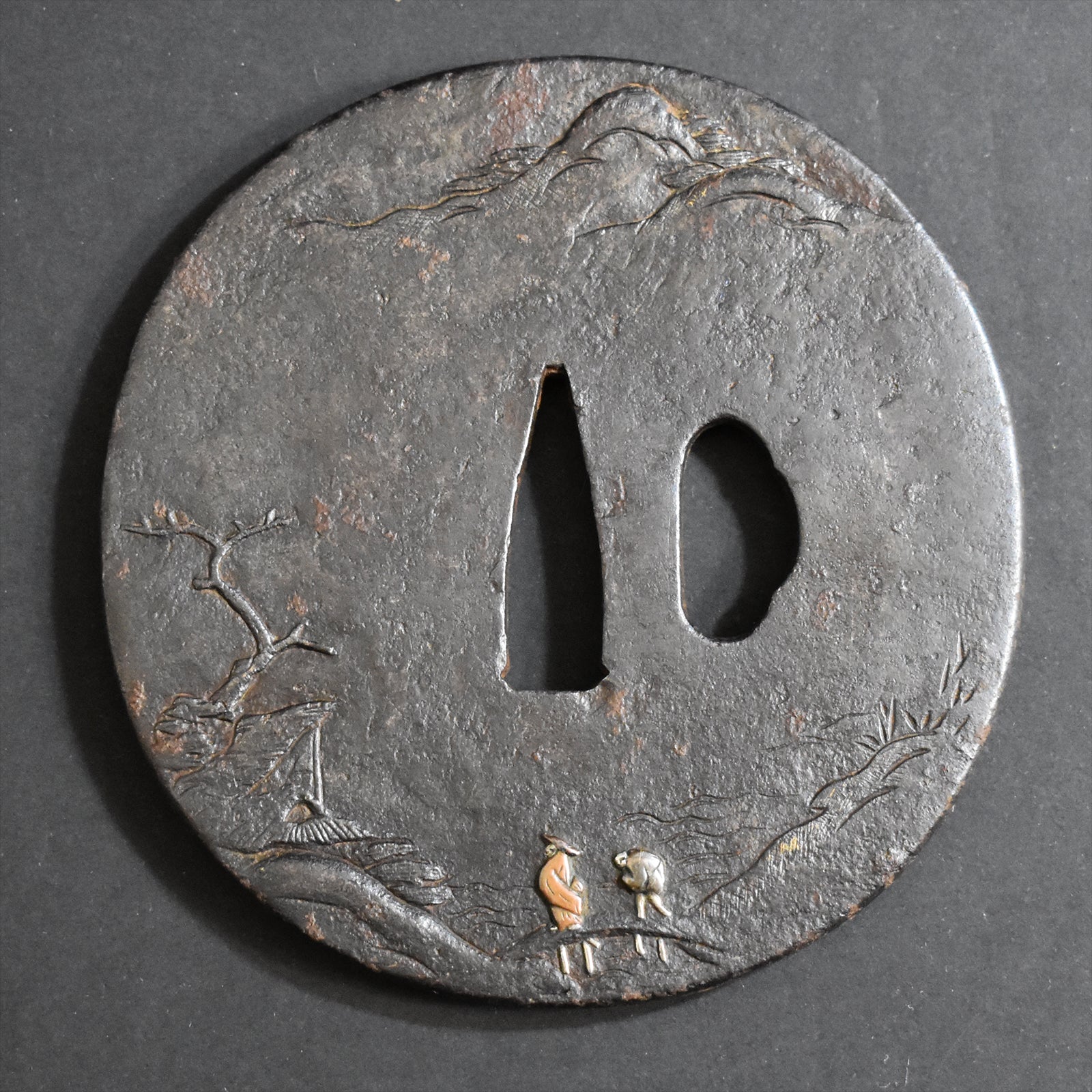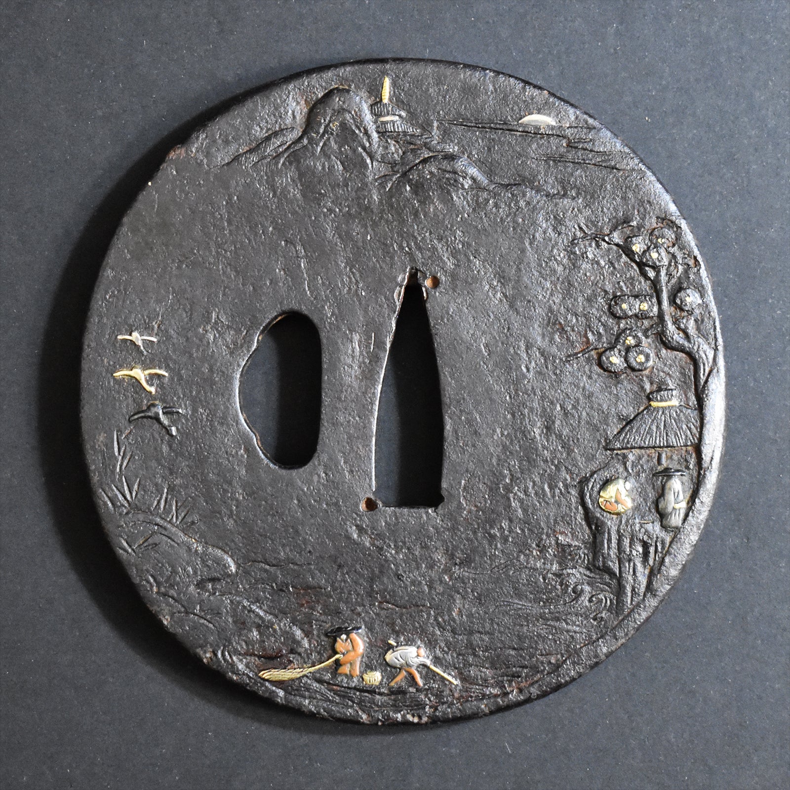 Antique TSUBA for KATANA Sword SHOUAMI 正阿弥 PAGODA AND LANDSCAPE TSUBA 塔山水図鐔 with NBTHK TOKUBETSU KICHO PAPER.