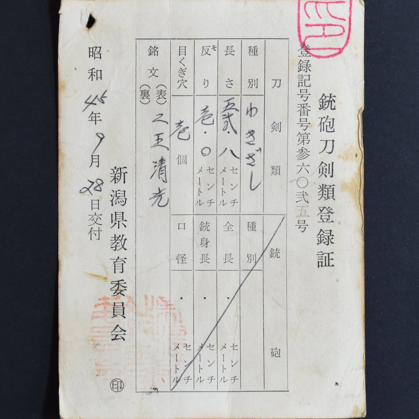 ・All our swords with hand forged blade are registered in the Agency for Cultural Affairs as artwork and The Board of Education(Cultural properties protection Committee); therefore each sword has the registration card, issued by the Board of Education.