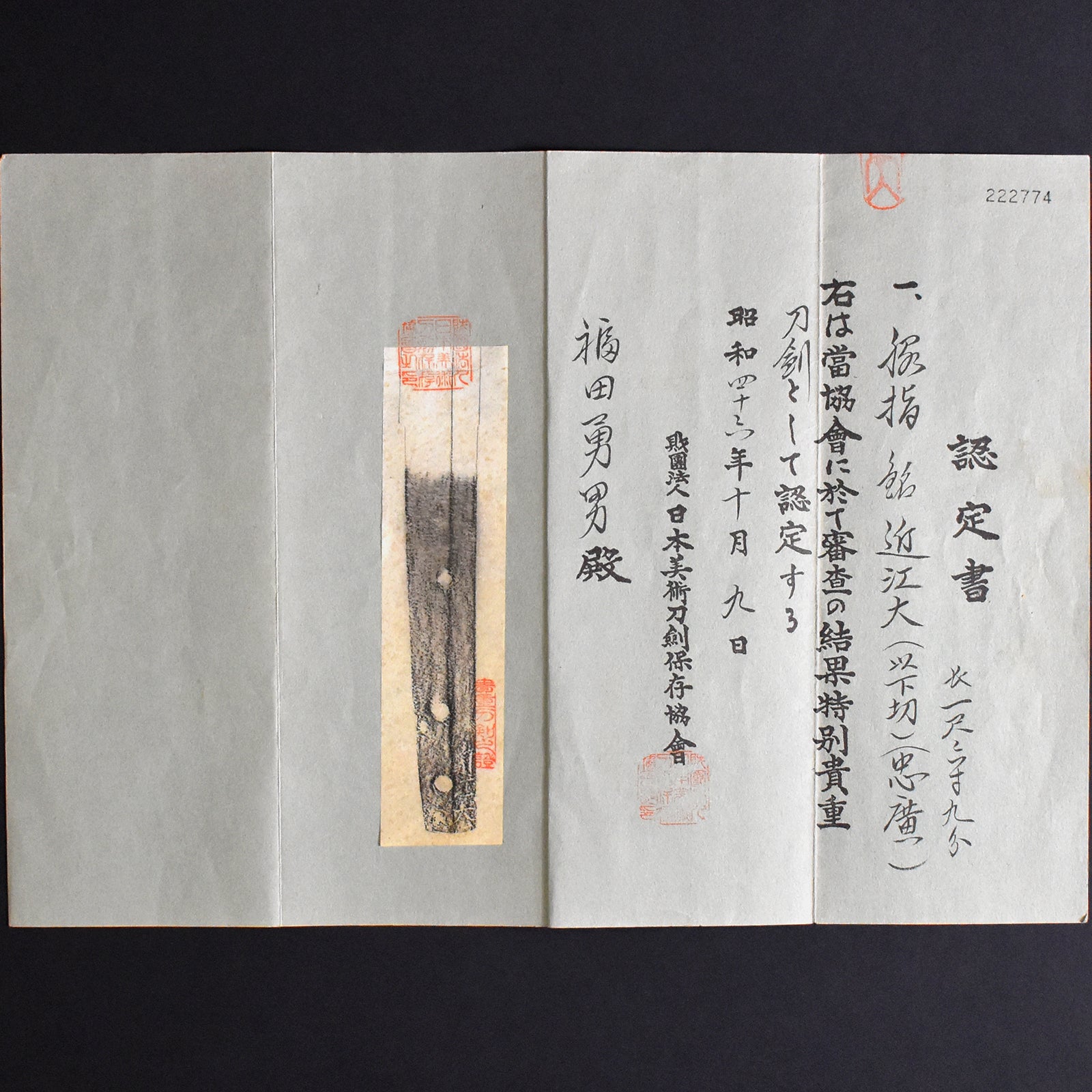 ・All our swords with hand forged blade are registered in the Agency for Cultural Affairs as artwork and The Board of Education(Cultural properties protection Committee); therefore each sword has the registration card, issued by the Board of Education.